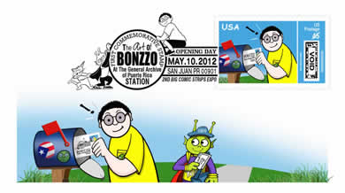 El Simpático personaje de la tirilla cómica puertorriqueña BONZZO vuelve a hacer de las suyas al ser reconocido por el Servicio Postal de los Estados Unidos (USPS por sus siglas en inglés) con otra Cancelación Pictórica (Matasellos), y con un Sello Conmemorativo para celebrar la apertura de su segunda Expo Tirillas Grandes, titulada: “El Arte de BONZZO Visita el Archivo General de Puerto Rico”